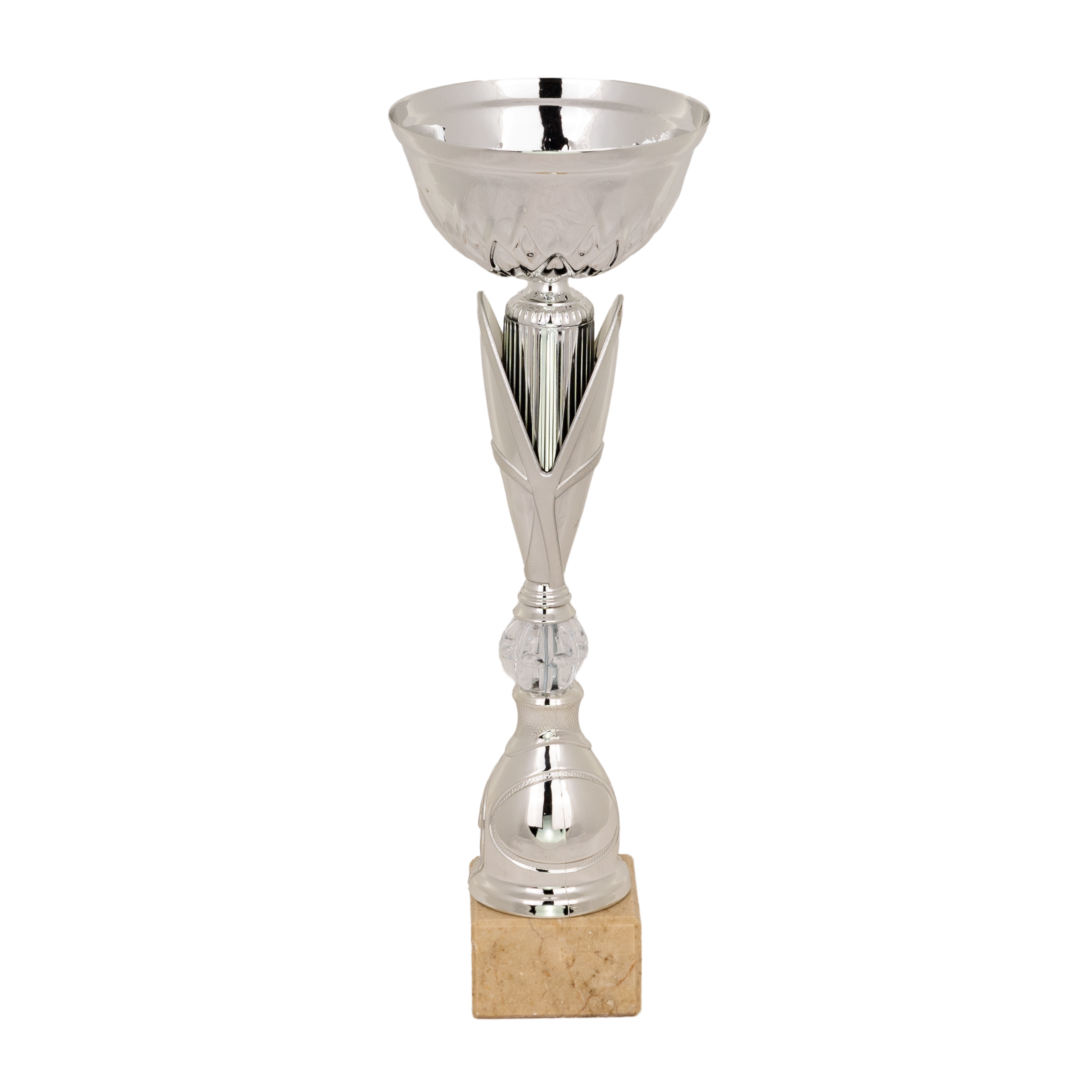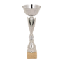 Metalowy puchar na białym marmurze.